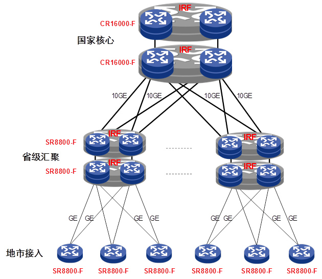 国家级广域网由于地域上覆盖的广阔性,对网络设备的可靠性和安全性要求极高,SR8800-F可以作为国家核心和省级汇聚节点。为了保证网络的安全性,在国家核心、省级节点采用上下行设备分开的设计架构;省级和地市节点同时作为城域网汇聚接入、专线汇聚、窄带接入。